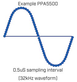 A Power Analyzer samples the voltage and current waveforms entering or exiting a device under test(DUT), this sampling process typically occurs every 0.5us to 1us depending upon the analyzer model being used, some lower specification models from other manufacturers may sample as low as 100ks/s. Once sampled, the data is processed by a dedicated high-speed digital signal processor (which can also be implemented on modern FPGAs) and the various derived parameters are calculated.