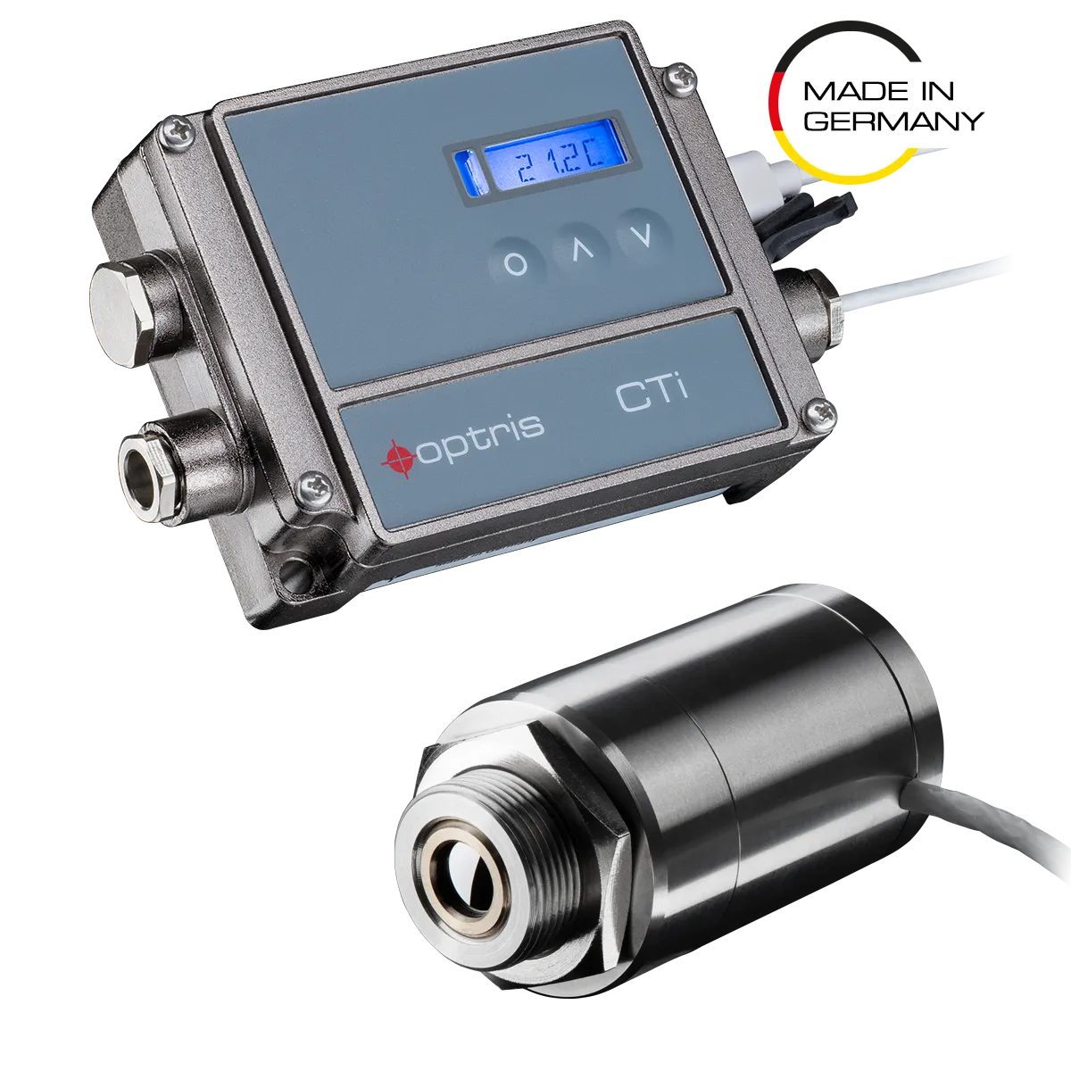 The separate control box of the CTi LThot provides high variability with selectable analog outputs and several digital interfaces. Its unique advantages for installation in applications with high surrounding temperatures stem from a robust and ambitious design, allowing operation of the sensing heads for temperatures up to 250 °C without additional cooling. The compact stainless-steel housing, measuring 29 mm in diameter and 55 mm in length, ensures durability in harsh conditions. The infrared pyrometer minimizes thermal gradients along the sensor head, optimizing thermal shock resistance for accuracy and repeatability in rapidly changing ambient temperatures.