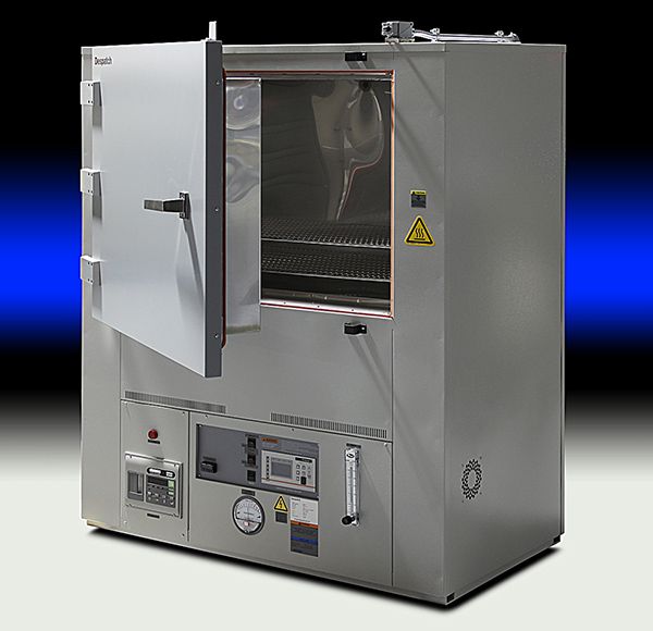 An economical method for processing high quality loads that require inert atmospheres. Used in applications to prevent oxidation of parts being processed. The oven features a purge flow meter and a maintain flow meter, a manual 3-way nitrogen valve and a chamber pressure gauge. A water cooling coil was included for the cooldown stage or for operating at lower temperatures.